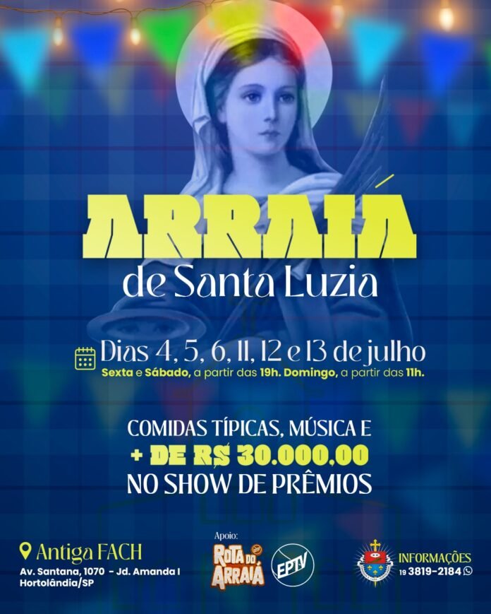 A Paróquia Santa Luzia realizará o seu tradicional Arraiá nos dias 4, 5, 6, 11, 12 e 13 de Julho na antiga FACH, na Avenida Santana, 1070 no Jardim Amanda I. (Sextas-feiras e sábado à partir das 19 horas. Domingos as 11horas).