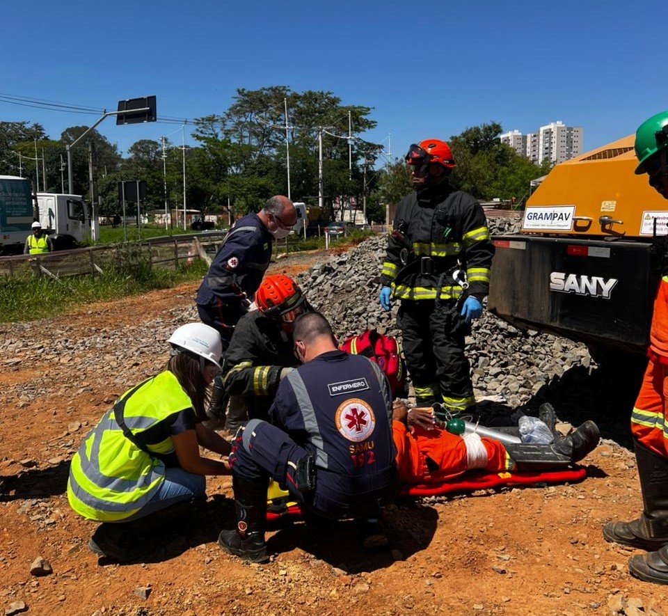 Trabalhadores de obras de grande porte estão sujeitos a acidentes. Para orientá-los sobre como evitar essas situações, o Serviço de Atendimento Móvel de Urgência (SAMU) de Hortolândia ministrou um simulado com operários da obra do viaduto na Vila Real, neste mês.